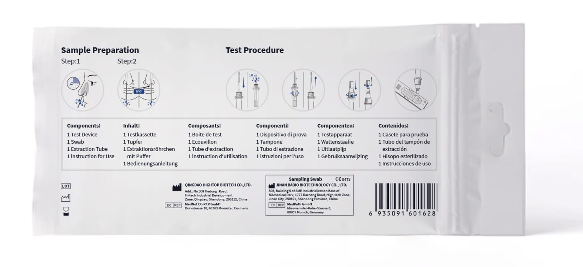 Im HIGHTOP Antigen-Schnelltest ist mit Ausnahme einer Stoppuhr und einem Müllbeutel alles enthalten, was Sie brauchen, um sich einfach selbst eine Probe aus dem vorderen Nasenhöhlenbereich zu entnehmen und vor Ort auszuwerten.